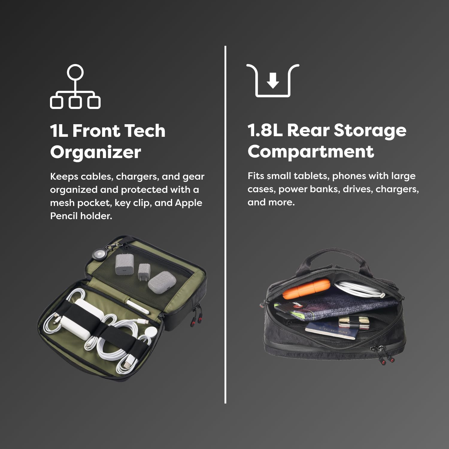 - TECH ORGANIZER: Keeps your cables, chargers and other items neatly organized and protected. Large zippered mesh pocket for smaller items and Tether Clip for keys, fobs and AirTags. Includes Stylus / Apple Pencil holder. Interior dimensions of 1 liter organizer side = 9.5 x 6.0 x 1.0 inches.