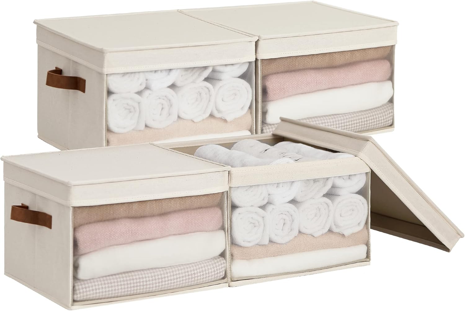 StorageWorks Storage Bins with Lid and Clear Window, Fabric Storage Boxes with Lids, Stackable Basket for Shelves, Closet Organizer and Storage Bins, Beige, Large, 4-Pack