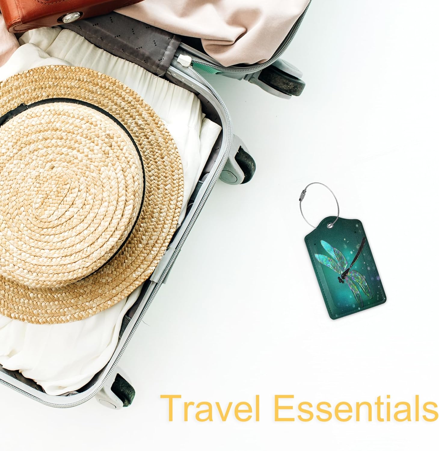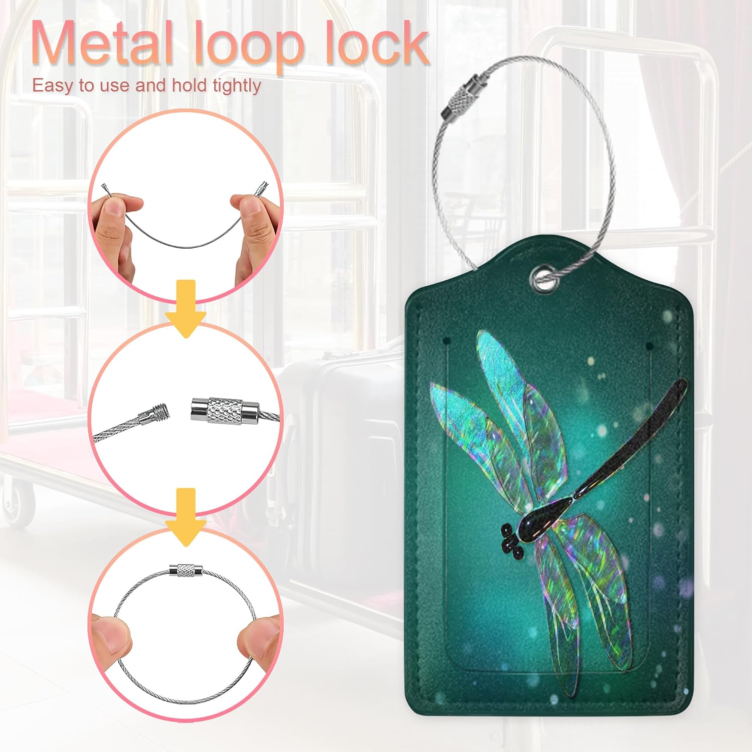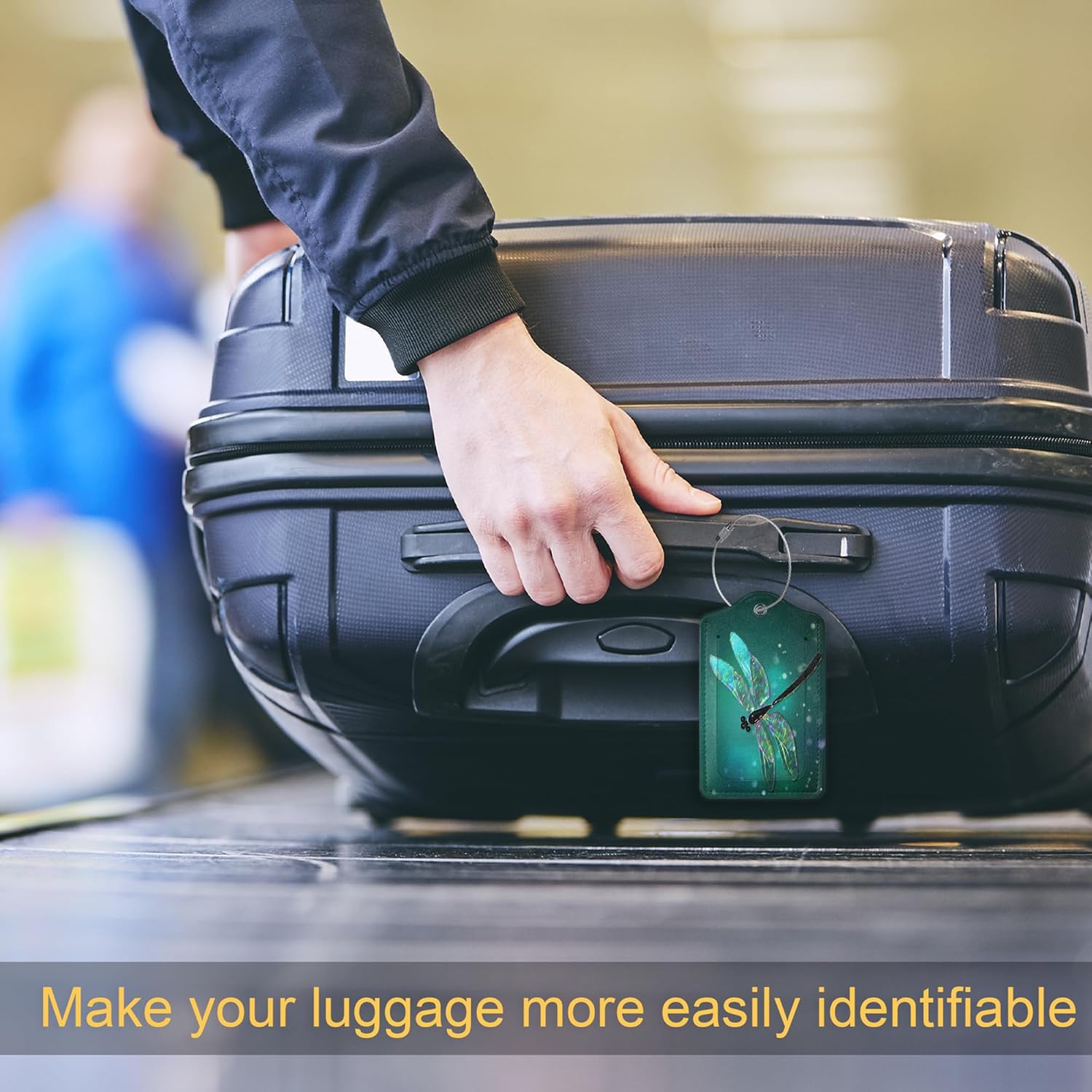 2 Pack Luggage Tag for Suitcase, Dragonfly Leather Suitcase Tags Identifiers with Privacy Name Address Labels & Durable Steel Loop for Women/Men Travel Fantasy Green Dragonfly