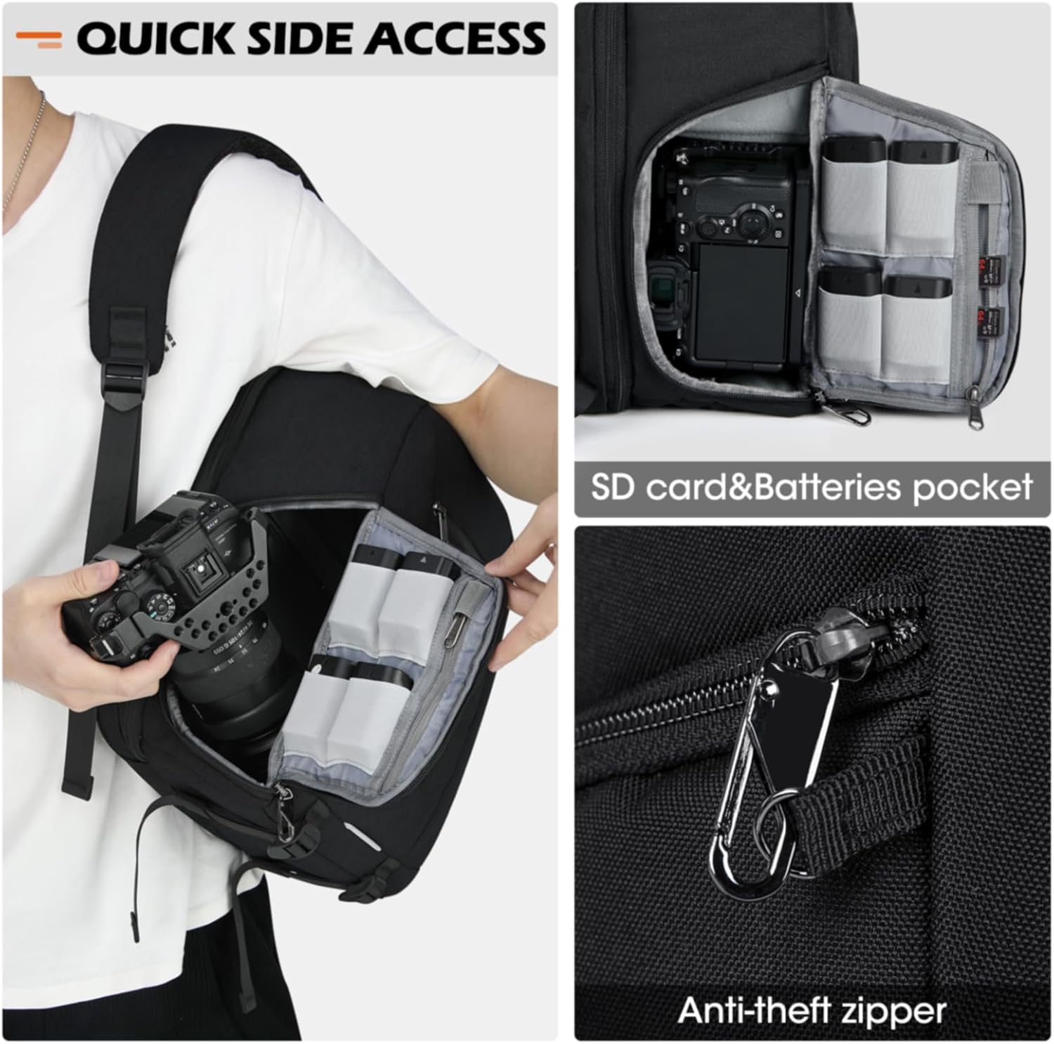 - 【Convenient&Practical】The quick-access design on the right side lets you slide out your DSLR camera.Never miss a photo opportunity on the go.Inside the lid,a zippered SD card pocket and four battery pockets for easy storage and use.Luggage straps keep your hands and back free when attaching photography bag to your luggage handle.On the left side is an elastic pocket for a tripod mount, secured with a strap.The bottom strap fits a full-size camera tripod,increasing your shooting versatility.