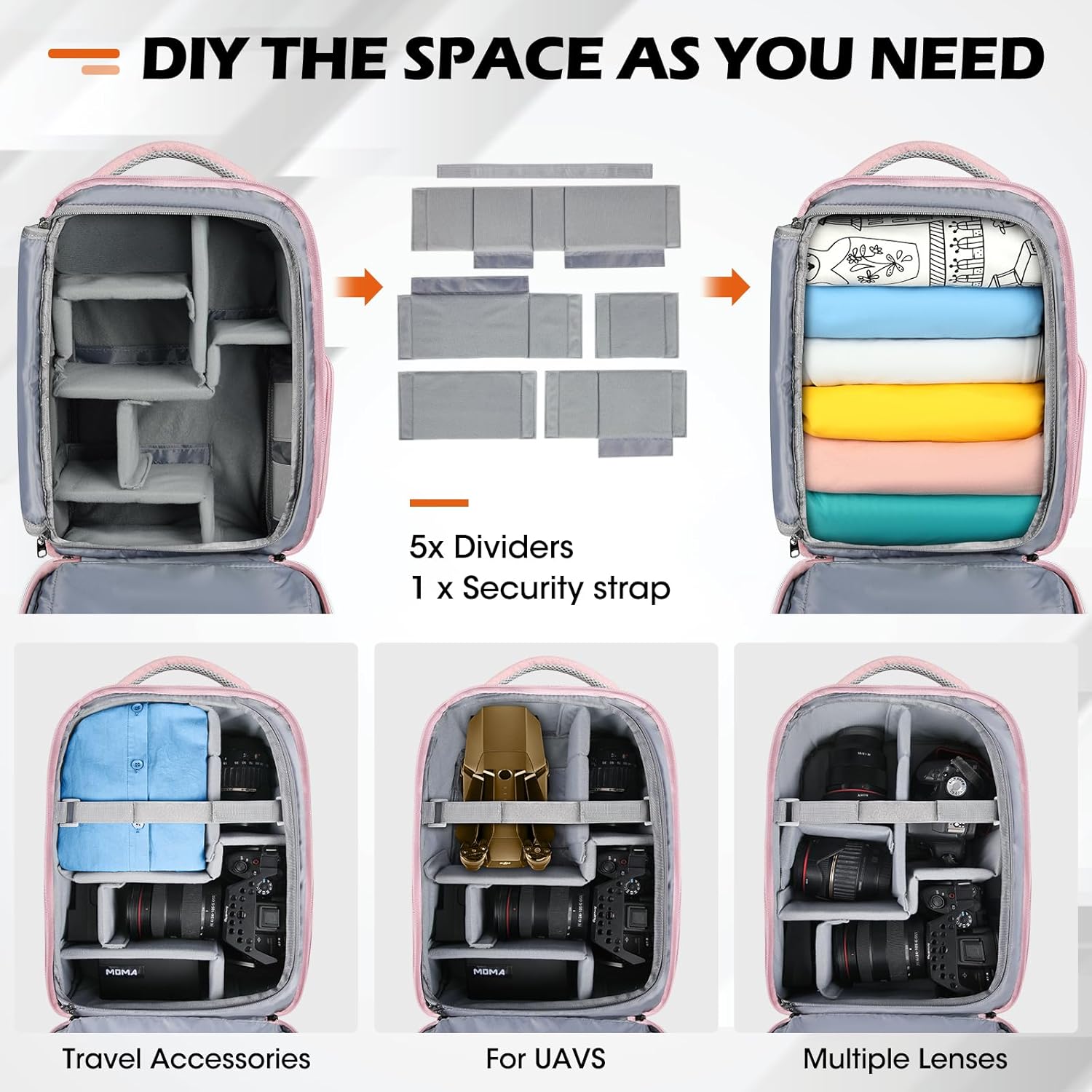 - 【Customizable Camera Compartment】The camera compartment features 5 removable padded dividers and an elastic strap to effectively separate and protect your valuable camera equipment.The interior space is customizable,so you can easily configure it to accommodate camera gear of varying sizes.And when the need to carry your camera subsides,the dividers can be effortlessly removed, transforming the camera backpack into a versatile travel or everyday backpack,catering to your changing needs.