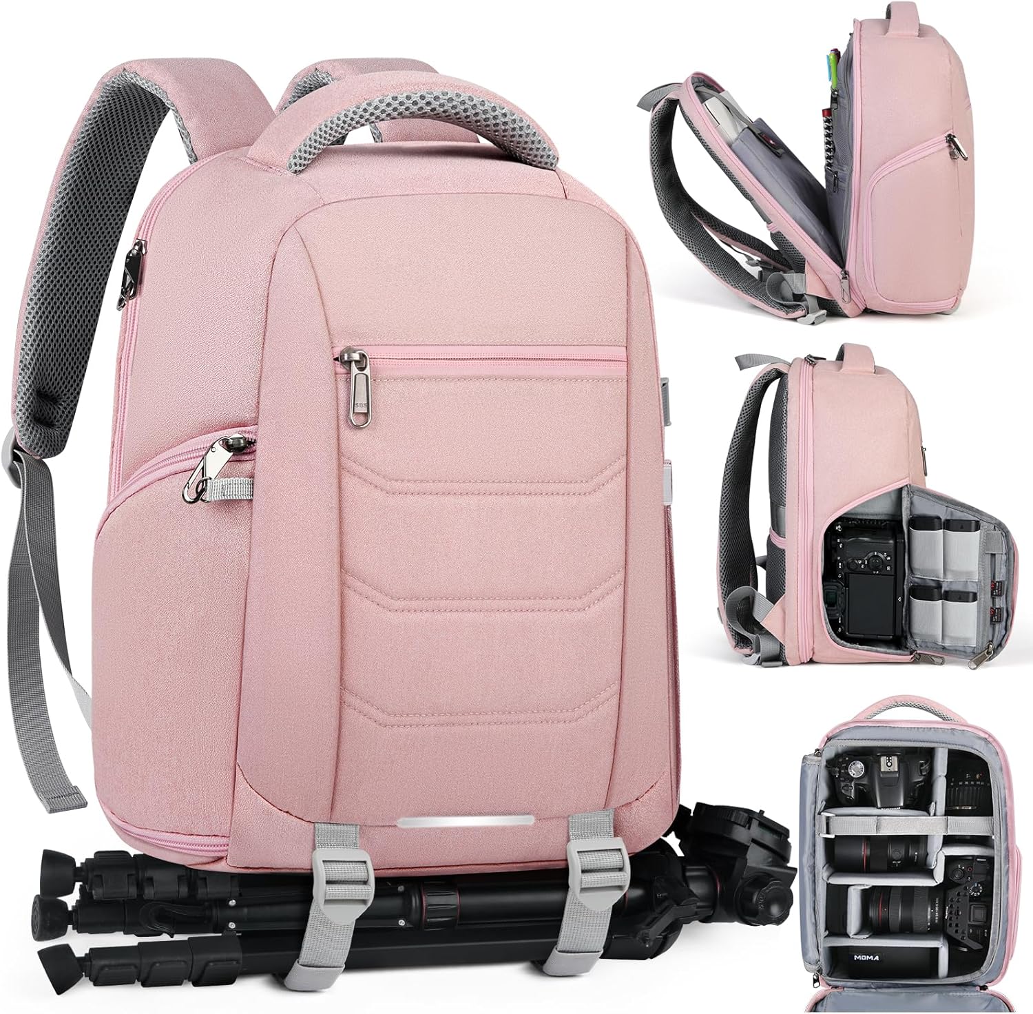 SDYSM Camera Bag Backpack Professional for DSLR SLR Mirrorless Camera Waterproof Laptop Back Pack 14 Inch with Rain Cover Anti Theft Travel Case Large Capacity Photography Backpack Pink