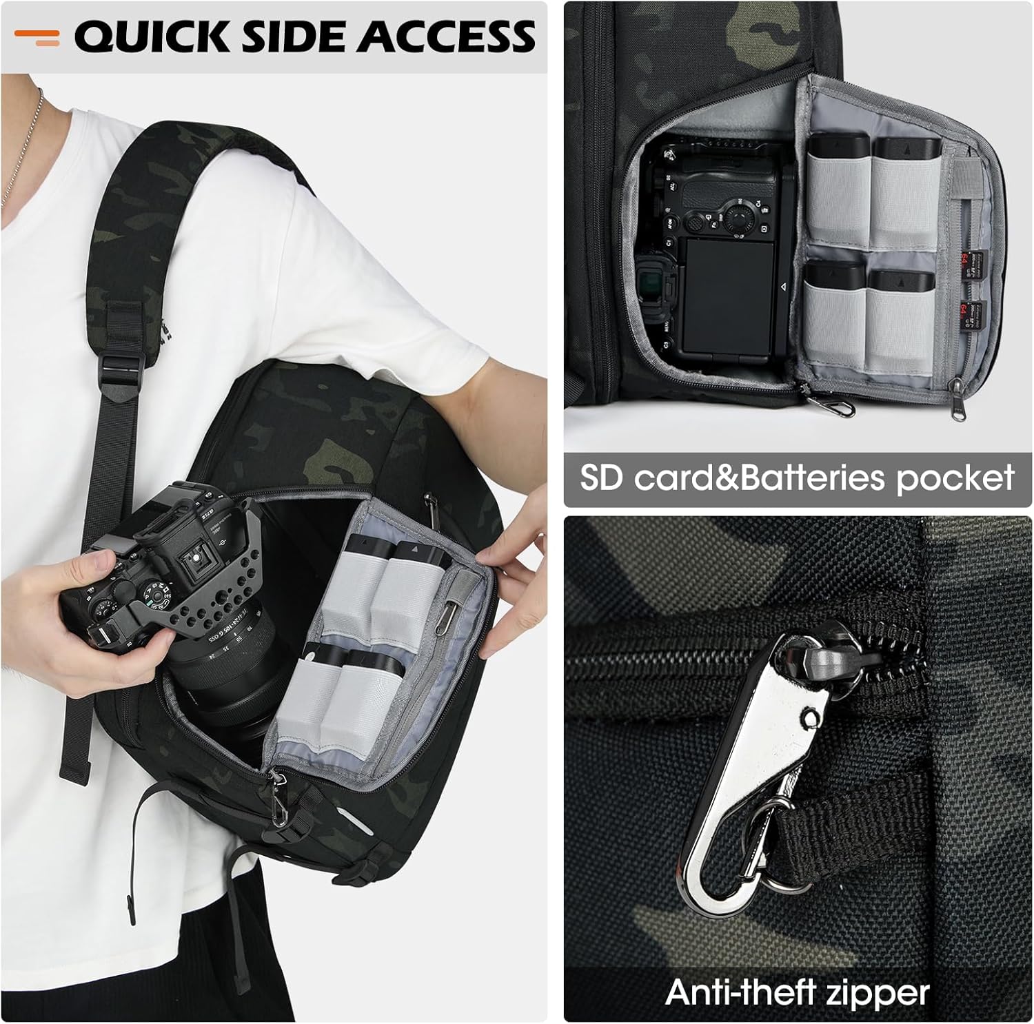 - 【Convenient&Practical】The quick-access design on the right side lets you slide out your DSLR camera.Never miss a photo opportunity on the go.Inside the lid,a zippered SD card pocket and four battery pockets for easy storage and use.Luggage straps keep your hands and back free when attaching photography bag to your luggage handle.On the left side is an elastic pocket for a tripod mount, secured with a strap.The bottom strap fits a full-size camera tripod,increasing your shooting versatility.