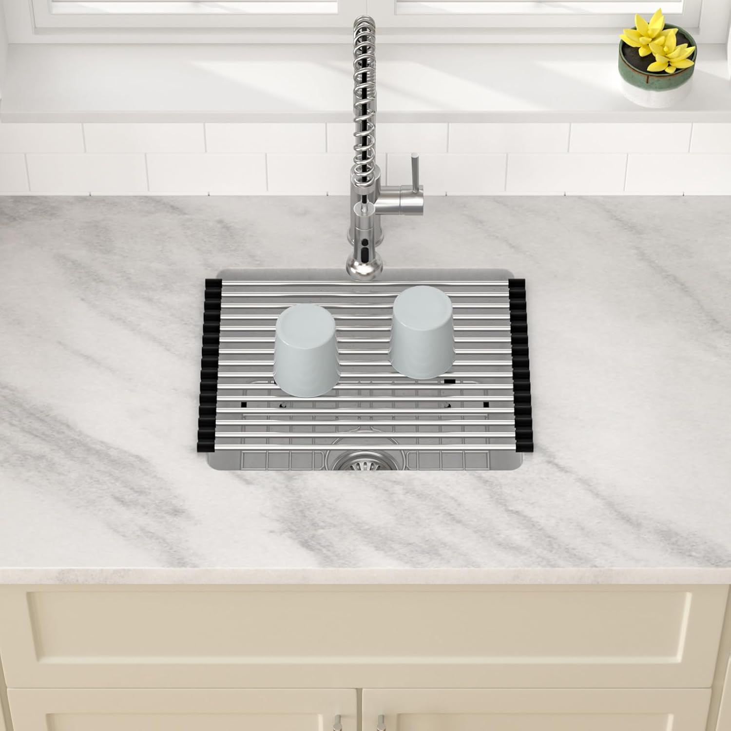 - Exteriors Dimension : 18"W x 16"D x 9"H; Internal Size: 16"Wx 14"Dx 9"H; Minimum Cabinet Size: 20 inches; Kit Includes: sink,stainless steel drainer, drying rack, bottom grid