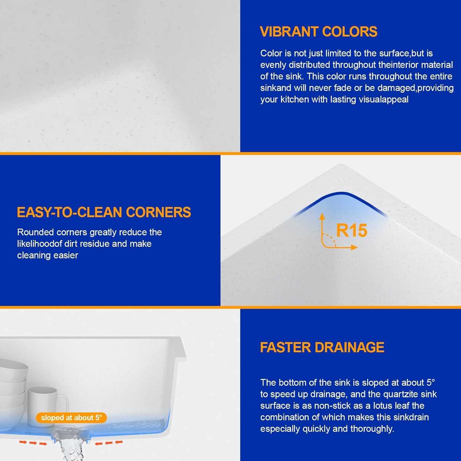 - High Quality Granite: Made of 80% natural granite and resin, the bright colors penetrate deeply into the quartz composite sink to maintain a beautiful appearance and are not easy to fade