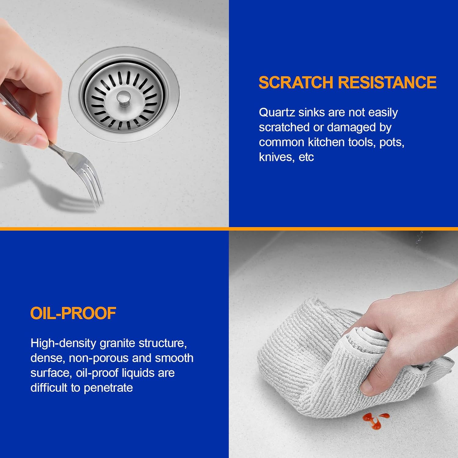- Easy to Clean and maintain: dense and non-porous sink structure, smooth touch, chemical corrosion resistance, oil stains are not easy to penetrate, just wipe with a soft cloth or mild detergent