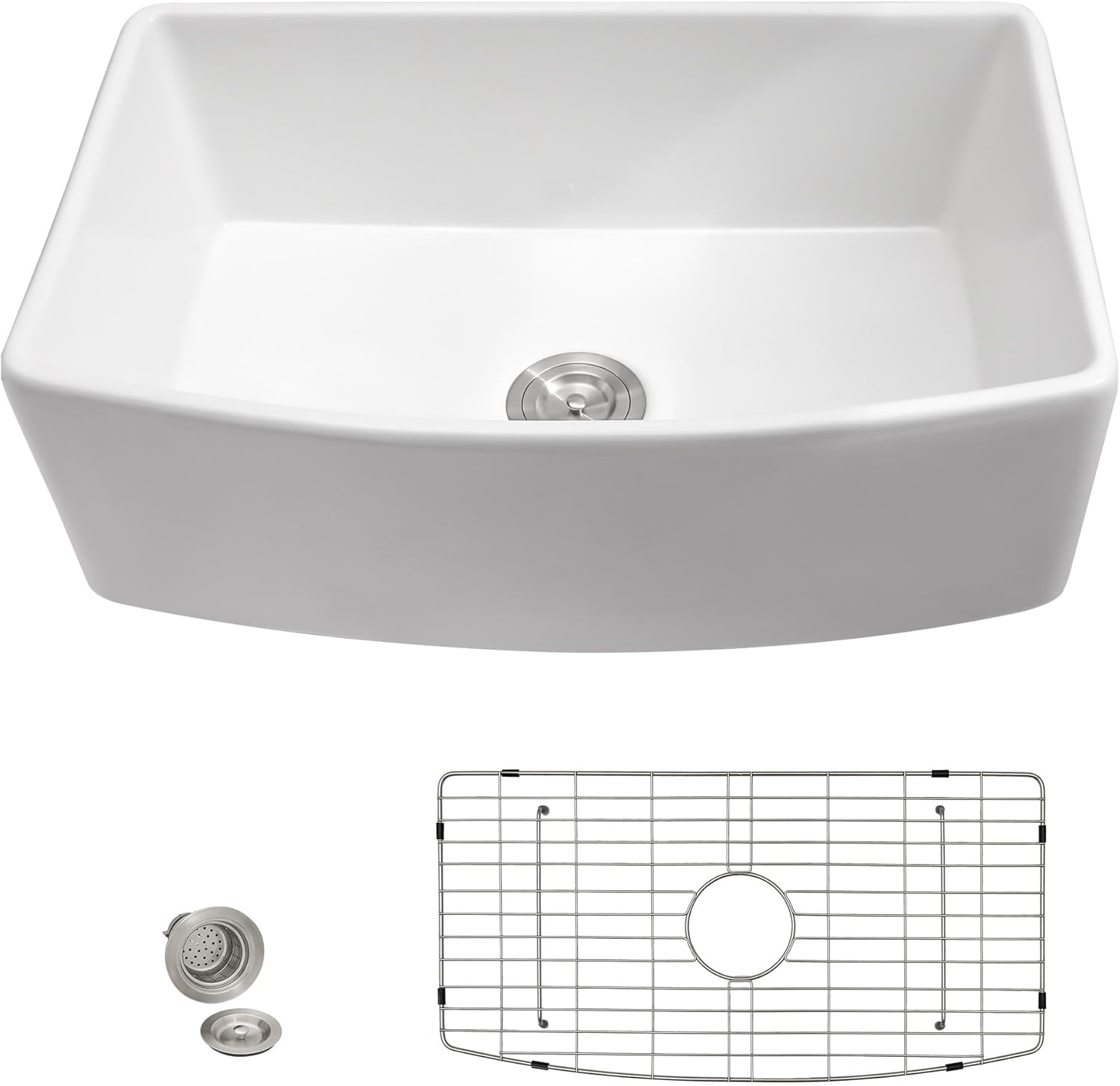 - 30 inch white curved apron front farmhouse sink is made of premium natural fire-resistant clay, fired at 2900°F, with an enamel high-gloss finish that makes it resistant to chips, fading and scratches, and sturdy enough to withstand high-temperature cookware.