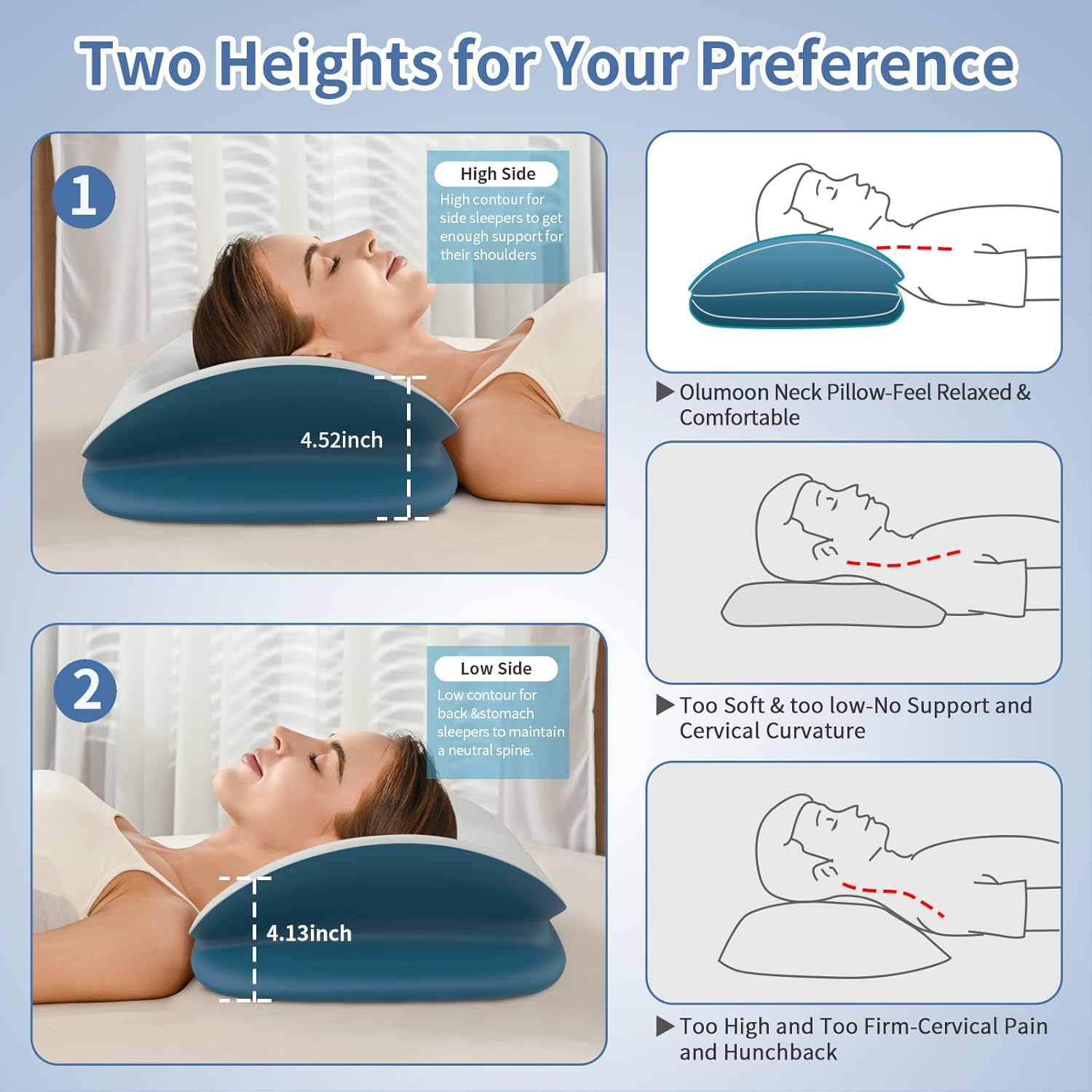 - [Stay Comfortable with Breathable Fabric]: Tired of waking up sweaty and uncomfortable? Our pillow for sleeping features a breathable fabric that keeps you fresh and dry all night. Additionally, our cervical pillow offers flexibility with two different heights to choose from: one side is 4.52 inches, and the other side is 4.13 inches, allowing you to customize your sleeping experience for maximum comfort and support.
