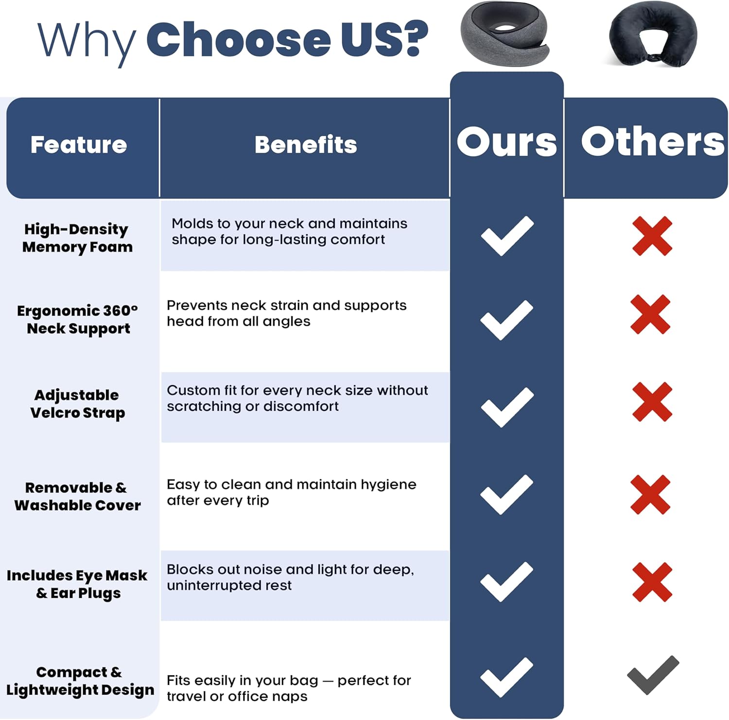 - CLOUD-LIKE COMFORT – Adaptive Premium Memory Foam Our slow-rebound memory foam molds to your unique shape, relieving pressure points while maintaining its structure. Ideal for long flights, commutes, or mid-day office naps.