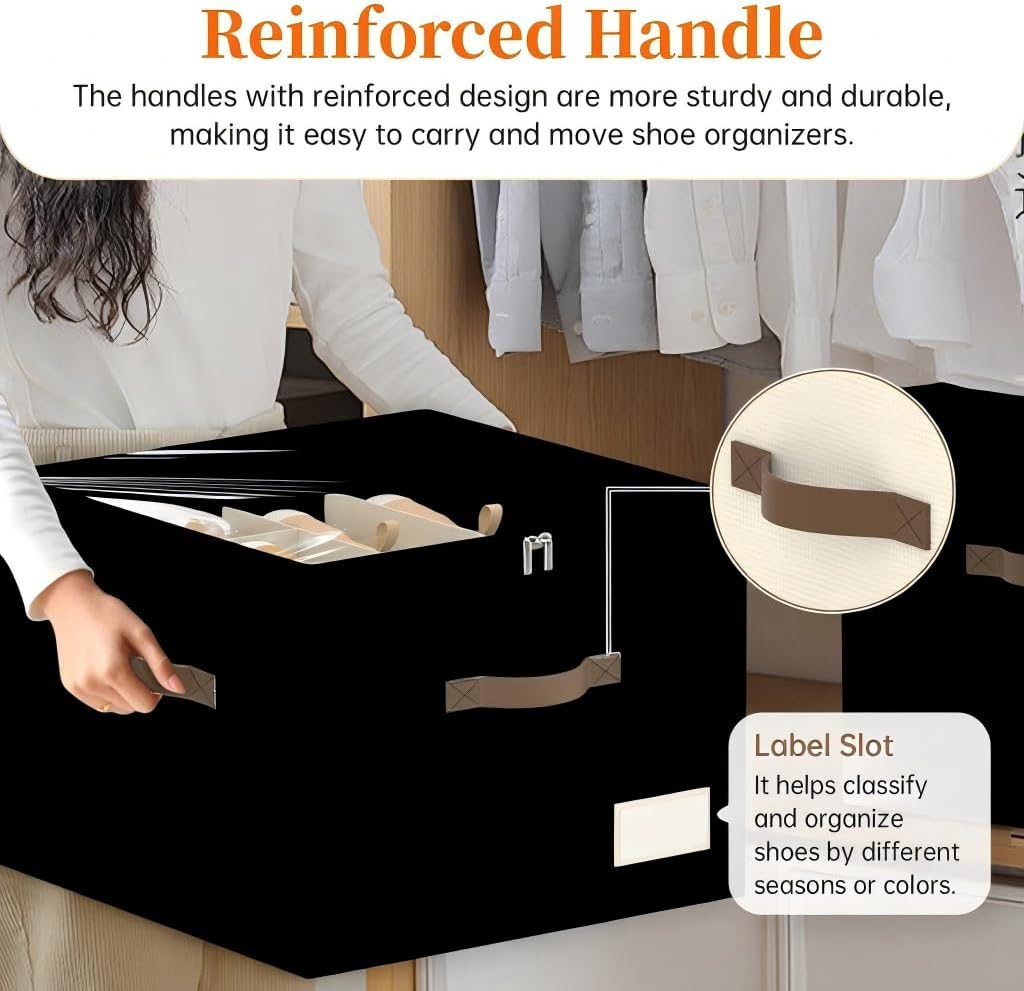 - 【Strong Structure & Bottom Support】: This shoe organizer containers are made form durable tear resistant non-woven fabric, make the shoe box stronger as a whole holding. The durable side panels and bottom plate ensure shoe storage bins stays in shape. The reinforced handles are more sturdy and durable, help you carry and move shoe organizers from closet or shelves easily.