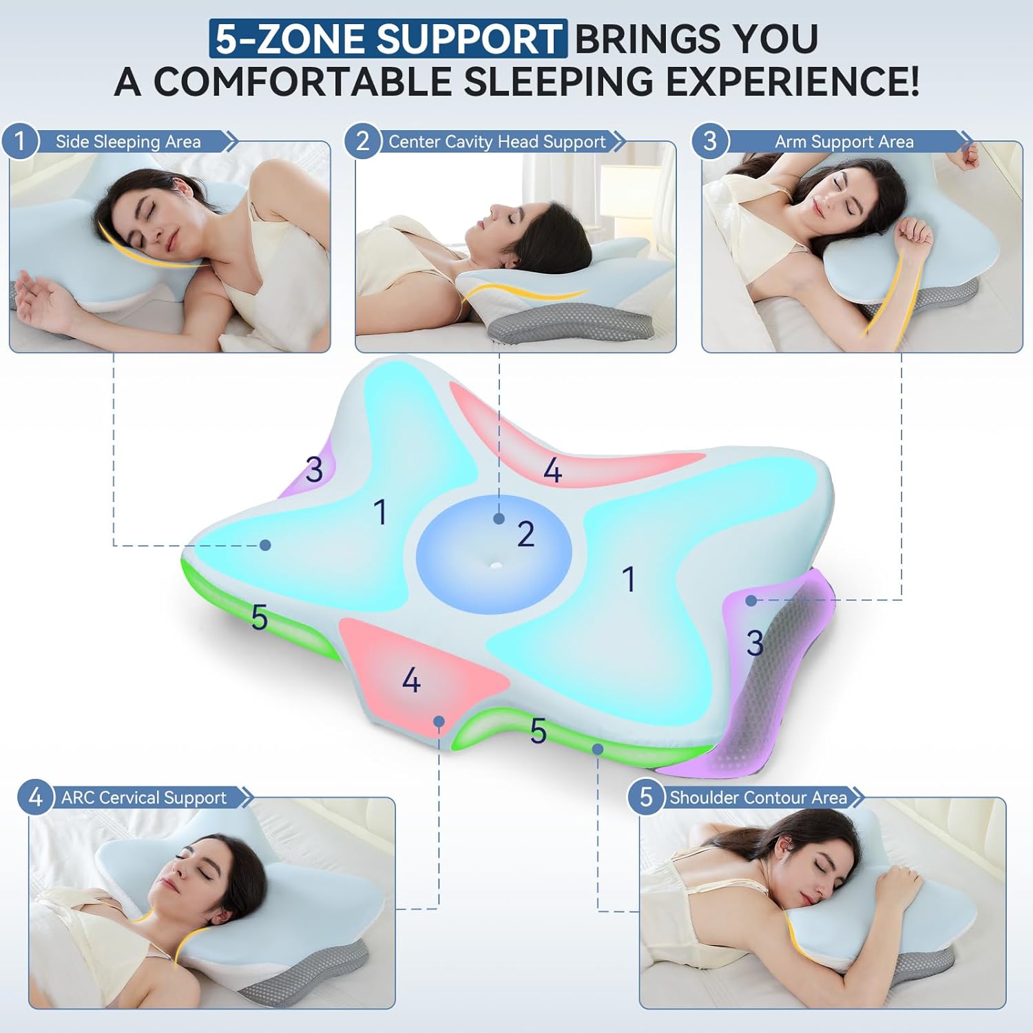 - 【ERGONOMICALLY NECK PILLOW】The cervical pillow adopts a unique butterfly shape design and hollow centre design, skillfully cradles your head, naturally fit your neck's curve and aligning your spine, allowing the entire body spine to be more efficiently supported, stretched and relaxed. Perfect for office workers, and travelers, this pillow reduces shoulder pressure and promotes deeper, pain-free sleep.